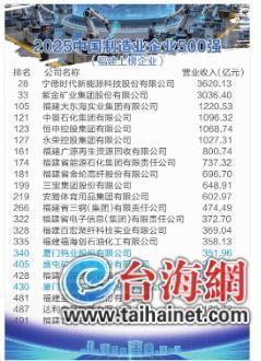 其中,宁德时代以3620.13亿元营业收入位居福建企业首位,排名全国第28位,继续领跑全球动力电池产业;紫金矿业以3036.40亿元排名33位,彰显福建在金属资源产业链上的竞争力。这两家企业也是福建唯二入围全国制造业前百强的企业。